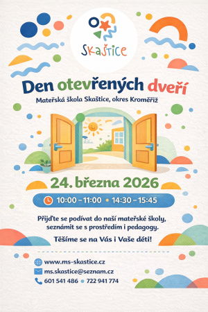 Mateřská škola Skaštice zve všechny rodiče i děti na den otevřených dveří, který proběhne 24. března 2026. Více informací na přiloženém letáčku.