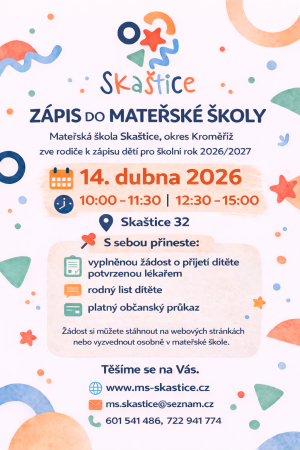 Mateřská škola Skaštice, okres Kroměříž, zve rodiče k zápisu dětí pro školní rok 2026/2027. Více informací na přiložené pozvánce.