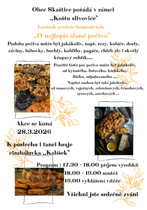 Obec Skaštice pořádá v rámci akce "Košt slivovice" 1. ročník soutěže hospodyněk "O nejlepší slané pečivo". Více informací na přiloženém letáčku.