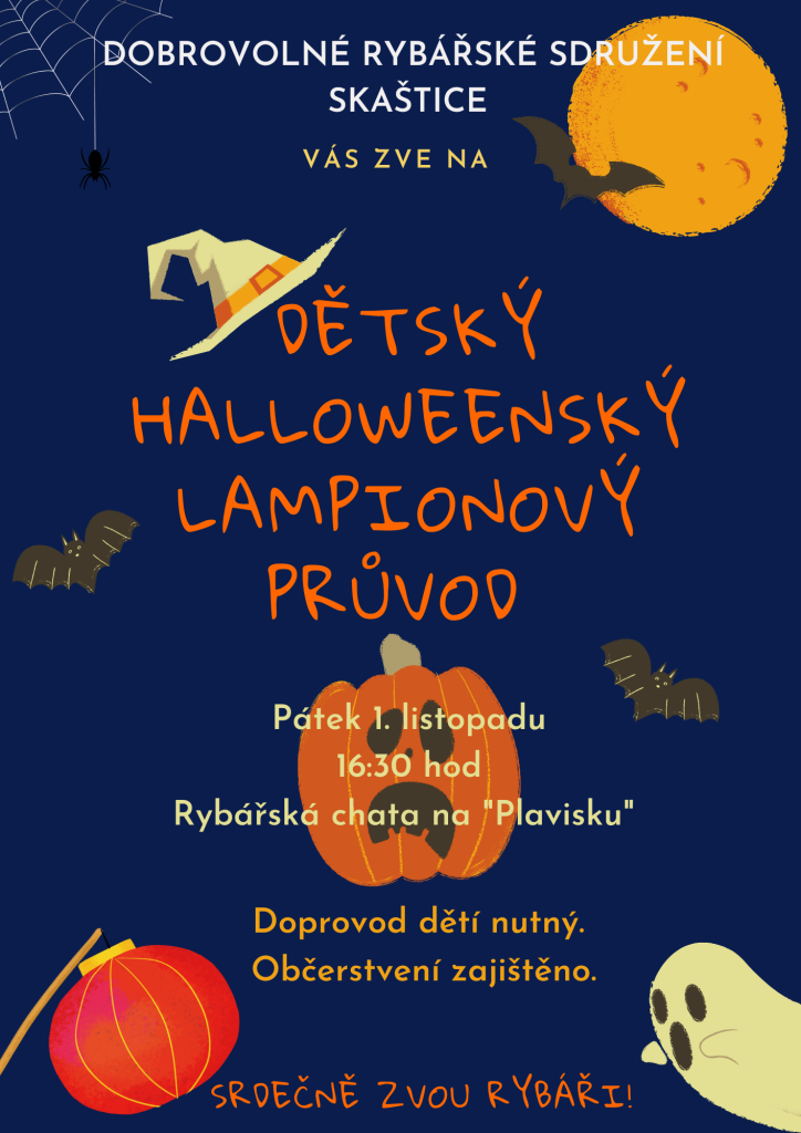 Dobrovolné rybářské sdružení Skaštice Vás srdečně zve na dětský halloweenský lampionový průvod, který proběhne v pátek, 1. listopadu 2024 od 16:30 hod na rybářské chatě na Plavisku. Doprovod dětí nutný. Občerstvení zajištěno.