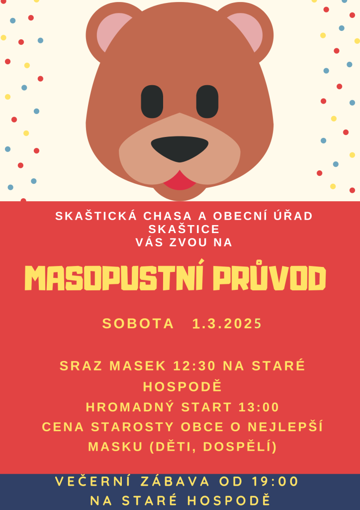 Skaštická chasa a Obecní úřad Skaštice Vás zvou na Masopustní průvod, který proběhne v sobotu 1.3.2025. Sraz masek 12:30 na Staré hospodě, hromadný start ve 13:00. Více informací na přiloženém letáčku.