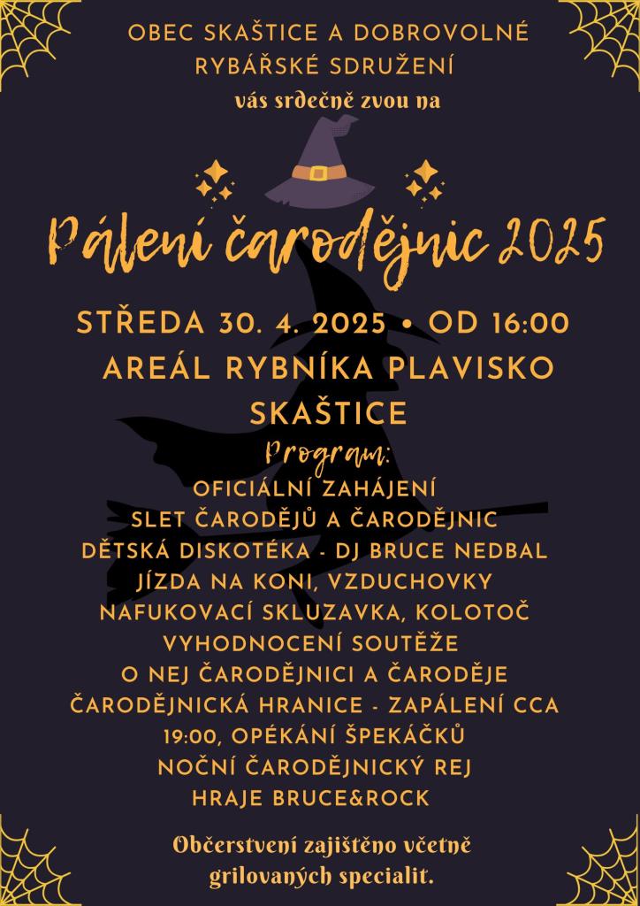 Ve středu 30. 4. 2025 od 16:00 se v areálu rybníka Plavisko uskuteční tradiční Pálení čarodějnic. Těšit se můžete mimo jiné i na dětskou diskotéku, atrakce a opékání špekáčků. Více informací na letáčku.