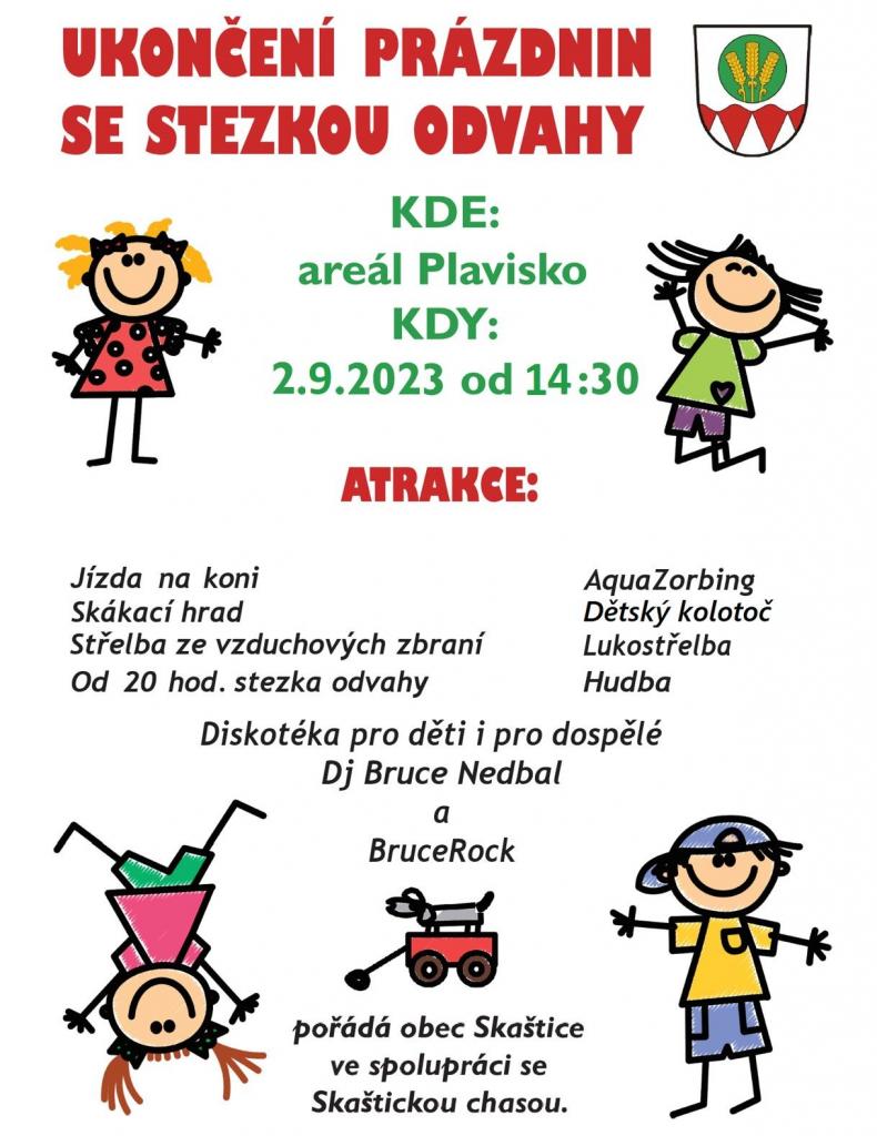 Obec Skaštice a Skaštická chasa vás srdečně zvou na akci Ukončení prázdnin, která se uskuteční v areálu rybníka Plavisko 2. září 2023 od 14:30 hod. Více informací včetně bohatého programu v přiložené pozvánce.