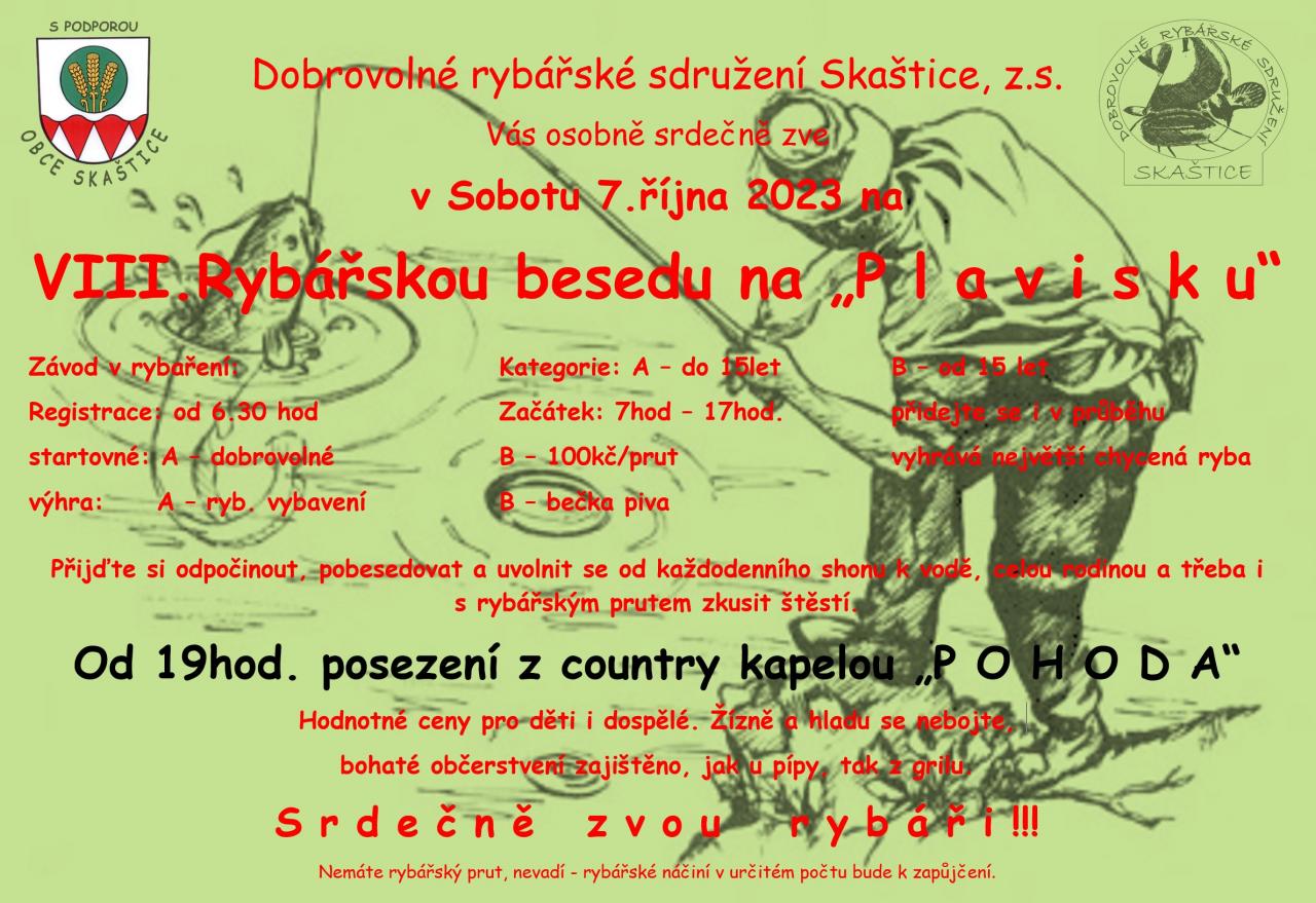 Dobrovolné rybářské sdružení Skaštice, z.s., Vás srdečně zve na VIII. Rybářskou besedu, která se uskuteční v sobotu 7. 10. 2023. Více informací na přiložené pozvánce.