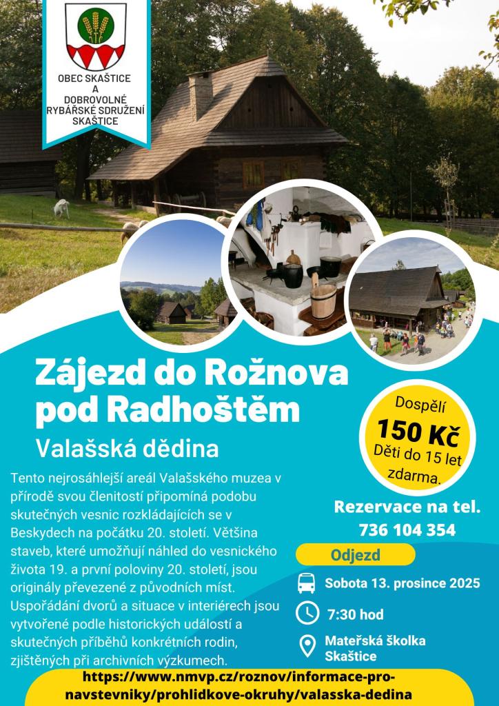 Obec Skaštice a Dobrovolné rybářské sdružení Skaštice Vás zvou na zájezd do Rožnova pod Radhoštěm, který se uskuteční 13. prosince 2025. Více informací na přiloženém letáčku.