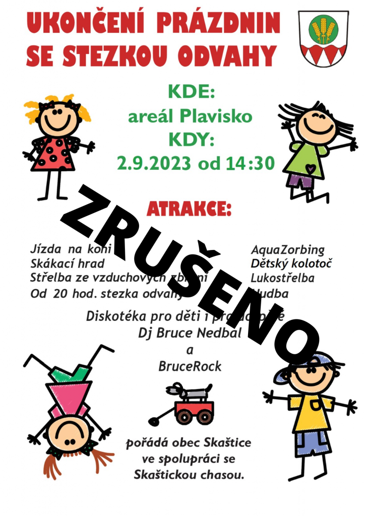 Oficiální odpolední program Akce Ukončení prázdnin je bohužel z důvodu kontaminace a otravy rybníka Plavisko zrušen. Z programu zůstává pouze stezka odvahy, která bude začínat v 19:30 hodin z malé louky za Plaviskem.